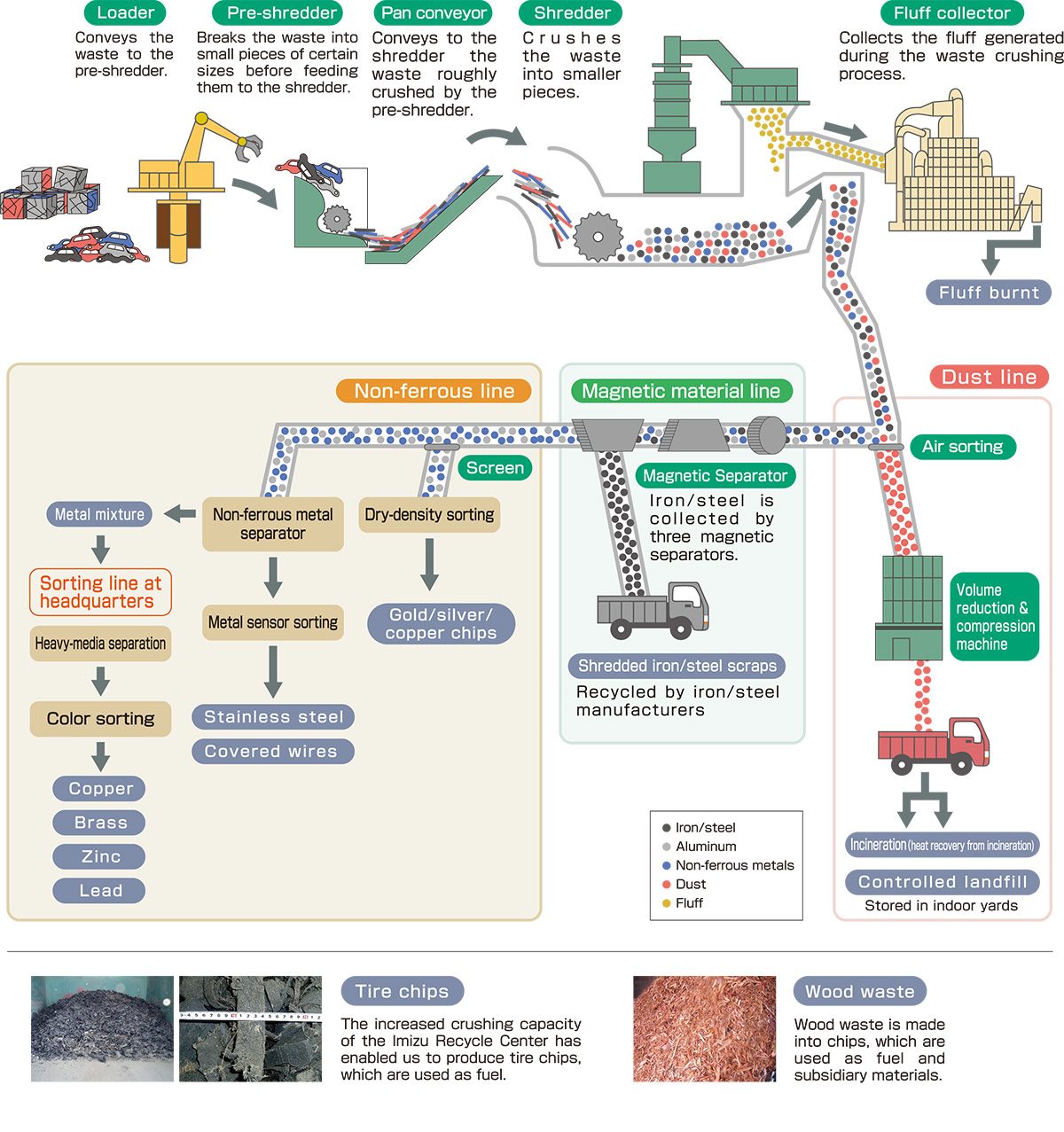 Making full use of Harita's accumulated know-how, the Imizu Recycle Center operates the most advanced shredder facilities, all of which are installed indoors. The facilities have a higher crushing capacity than ever before and can be readily adjusted to crush waste into different sizes. This center's separation systems not only recover iron/steel and aluminum and other non-ferrous metals but can also automatically collect tiny particles or substances otherwise barely detectable in refuse. Waste of all kinds can be separated and sorted by type of material.